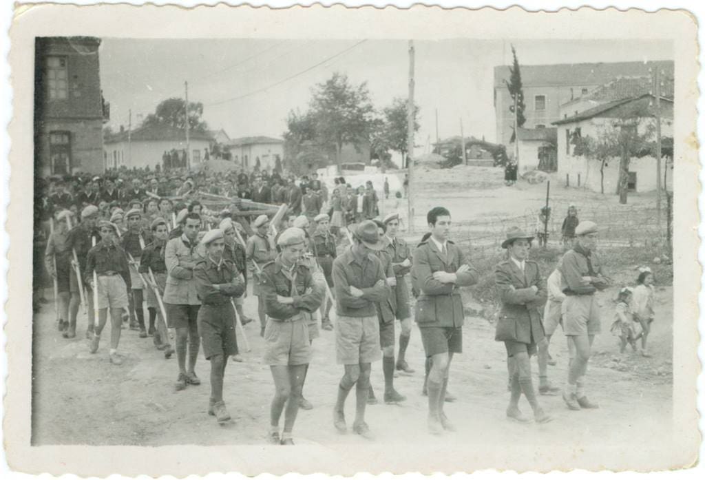 διακρίνεται στα δεξιά η καπναποθήκη Γκλέν και στα αριστερά στο βάθος το καμπαναριό και η στέγη του Αγ. Αθανασίου και οι πρόσκοποι της εποχής.