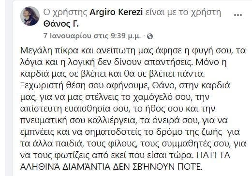 Μεγάλη πίκρα και ανείπωτη μας άφησε η φυγή σου, τα λόγια και η λογική δεν δίνουν απαντήσεις. Μόνο η καρδιά μας σε βλέπει και θα σε βλέπει πάντα. Ξεχωριστή θέση σου αφήνουμε, Θάνο, στην καρδιά μας, για να μας στέλνεις το χαμόγελό σου, την απίστευτη ευαισθησία σου, το ήθος σου και την πνευματική σου καλλιέργεια, τα όνειρά σου, για να εμπνέεις και να σηματοδοτείς το δρόμο της ζωής για τα άλλα παιδιά, τους φίλους, τους συμμαθητές σου, για να τους φωτίζεις από εκεί που είσαι τώρα. ΓΙΑΤΊ ΤΑ ΑΛΗΘΙΝΆ ΔΙΑΜΆΝΤΙΑ ΔΕΝ ΣΒΉΝΟΥΝ ΠΟΤΈ.