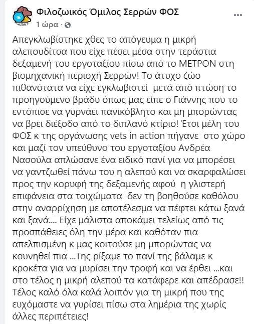 «Απεγκλωβίστηκε χθες το απόγευμα η μικρή αλεπουδίτσα που είχε πέσει μέσα στην τεράστια δεξαμενή του εργοταξίου πίσω από το ΜΕΤΡΟΝ στη βιομηχανική περιοχή Σερρών! Το άτυχο ζώο πιθανότατα να είχε εγκλωβιστεί μετά από πτώση το προηγούμενο βράδυ όπως μας είπε ο Γιάννης που το εντόπισε να γυρνάει πανικόβλητο και μη μπορώντας να βρει διέξοδο από το διπλανό κτίριο! Έτσι μέλη του ΦΟΣ κ της οργάνωσης vets in action πήγανε στο χώρο και μαζί τον υπεύθυνο του εργοταξίου Ανδρέα Νασούλα απλώσανε ένα ειδικό πανί για να μπορέσει να γαντζωθεί πάνω του η αλεπού και να σκαρφαλώσει προς την κορυφή της δεξαμενής αφού η γλιστερή επιφάνεια στα τοιχώματα δεν τη βοηθούσε καθόλου στην αναρρίχηση με αποτέλεσμα να πέφτει κάτω ξανά και ξανά…. Είχε μάλιστα αποκάμει τελείως από τις προσπάθειες όλη την μέρα και καθόταν πια απελπισμένη κ μας κοιτούσε μη μπορώντας να κουνηθεί πια …Της ρίξαμε το πανί της βάλαμε κ κροκέτα για να μυρίσει την τροφή και να έρθει …και στο τέλος η μικρή αλεπού τα κατάφερε και απέδρασε!! Τέλος καλό όλα καλά λοιπόν για τη μικρή που της ευχόμαστε να γυρίσει πίσω στα λημέρια της χωρίς άλλες περιπέτειες!»