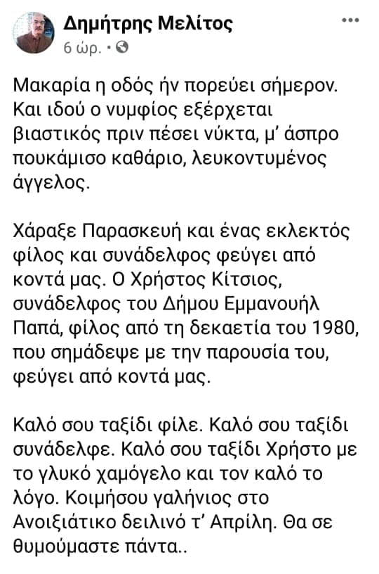 Τον φίλο του Χρήστο Κίτσιο που απεβίωσε, αποχαιρετά με συγκινητικά λόγια ο Δημήτρης Μελίτος.
