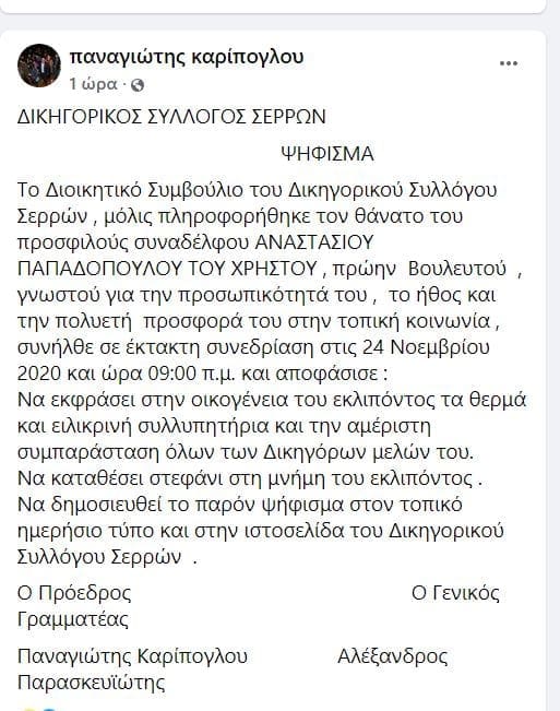 «Το Διοικητικό Συμβούλιο του Δικηγορικού Συλλόγου Σερρών , μόλις πληροφορήθηκε τον θάνατο του προσφιλούς συναδέλφου ΑΝΑΣΤΑΣΙΟΥ ΠΑΠΑΔΟΠΟΥΛΟΥ ΤΟΥ ΧΡΗΣΤΟΥ , πρώην Βουλευτού , γνωστού για την προσωπικότητά του , το ήθος και την πολυετή προσφορά του στην τοπική κοινωνία , συνήλθε σε έκτακτη συνεδρίαση στις 24 Νοεμβρίου 2020 και ώρα 09:00 π.μ. και αποφάσισε :