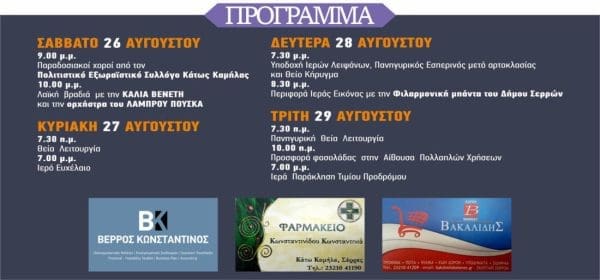 Στο πλαίσιο των εκδηλώσεων θα παρουσιαστούν παραδοσιακοί χοροί, θα διεξαχθεί λαϊκό γλέντι, ενώ την Τρίτη 29 Αυγούστου 2023 μετά την Θεία Πανηγυρική Λειτουργία θα προσφερθεί φασολάδα στην αίθουσα πολλαπλών χρήσεων του συλλόγου.