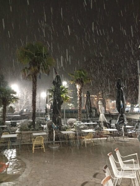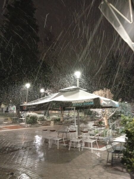 Από αργά το απόγευμα, οι νιφάδες άρχισαν να πέφτουν πυκνές, καλύπτοντας στέγες, αυτοκίνητα και παρτέρια, προκαλώντας ενθουσιασμό σε μικρούς και μεγάλους.