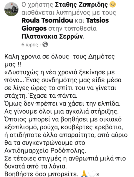 Έκκληση προς τους δημότες να στηρίξουν την οικογένεια απευθύνει ο Αντιδήμαρχος Σιντικής, Στάθης Ζαπρίδης, τονίζοντας ότι η νέα χρονιά ξεκίνησε με μια ιδιαίτερα δύσκολη δοκιμασία για συνδημότη τους.
