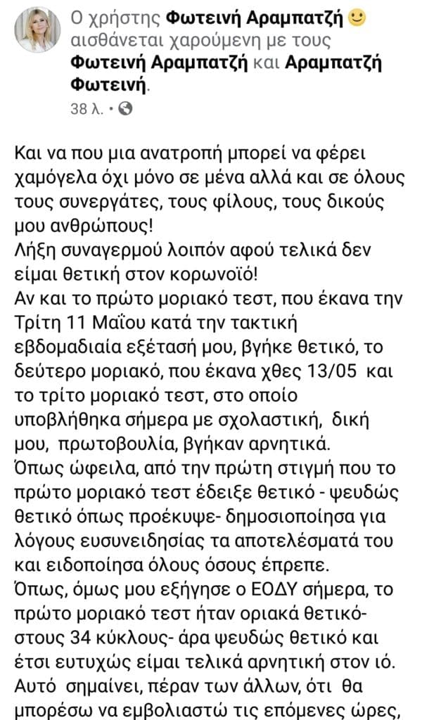 Αν και το πρώτο μοριακό τεστ, που έκανα την Τρίτη 11 Μαΐου κατά την τακτική εβδομαδιαία εξέτασή μου, βγήκε θετικό, το δεύτερο μοριακό, που έκανα χθες 13/05 και το τρίτο μοριακό τεστ, στο οποίο υποβλήθηκα σήμερα με σχολαστική, δική μου, πρωτοβουλία, βγήκαν αρνητικά.