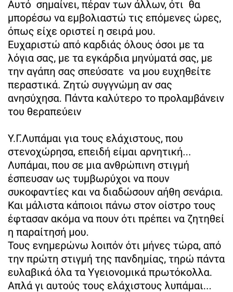 Να θυμίσουμε πως εχθές πάλι η ίδια είχε ανακοινώσει ότι ήταν θετική.