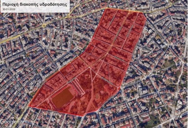 «Λόγω αναγκαίας επισκευής βλάβης δευτερεύοντος δικτύου ύδρευσης επί της οδού Ανατ. Θράκης, σήμερα Παρασκευή 30-01-2026 και στις ώρες 11:30’ έως 13:30’, θα σημειωθεί διακοπή υδροδότησης στην περιοχή που περικλείεται από τις οδούς: