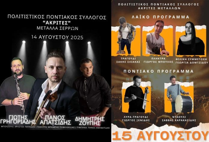Ο Πολιτιστικός Ποντιακός Σύλλογος “Ακρίτες” Μετάλλων διοργανώνει και φέτος ένα μοναδικό διήμερο εκδηλώσεων για τον Δεκαπενταύγουστο, στα Μέταλλα Σερρών.