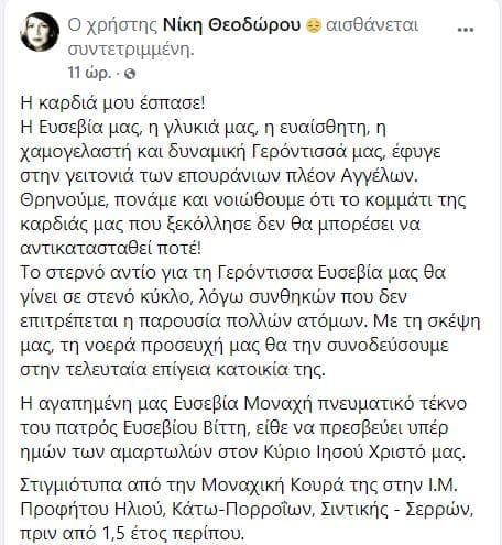 Την απώλεια της Γερόντισσας Ευσεβίας ανακοινώνει η Νίκη Θεοδώρου στον λογαριασμό της στο facebook.