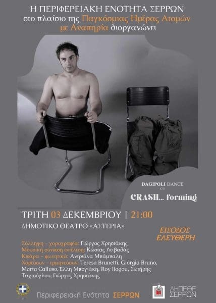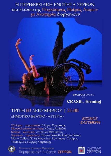 Στις 21:00 στο δημοτικό θέατρο «ΑΣΤΕΡΙΑ» θα πραγματοποιηθεί μουσικοχορευτική παράσταση με την συμμετοχή της ομάδα σύγχρονου χορού DAGIPOLI DANCE Co (χορευτές με κινητική αναπηρία και μη) και τους τραγουδοποιούς/μουσικούς Κώστα Λειβαδά (πιάνο) και Ανδριάνα Μπάμπαλη (κιθάρα -φωνή)
