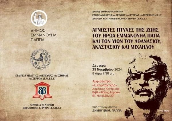 Σέρρες: Εκδήλωση για τη ζωή του ήρωα Εμμ. Παπά και των γιών του