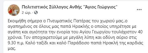 «Εκοιμήθη σήμερα ο Πνευματικός Πατέρας του χωριού μας..ο αγαπημένος σε όλους μας παπά Ηρακλής ο οποίος υπηρέτησε με αγάπη και αγιότητα την ενορία του Αγίου Γεωργίου τουλάχιστον 40 χρόνια. Τον αποχαιρετούμε με μεγάλη λύπη και οδύνη αύριο στις 9.30 π.μ. Καλό ταξίδι και καλό Παράδεισο παπά Ηρακλή της καρδιάς μας.»