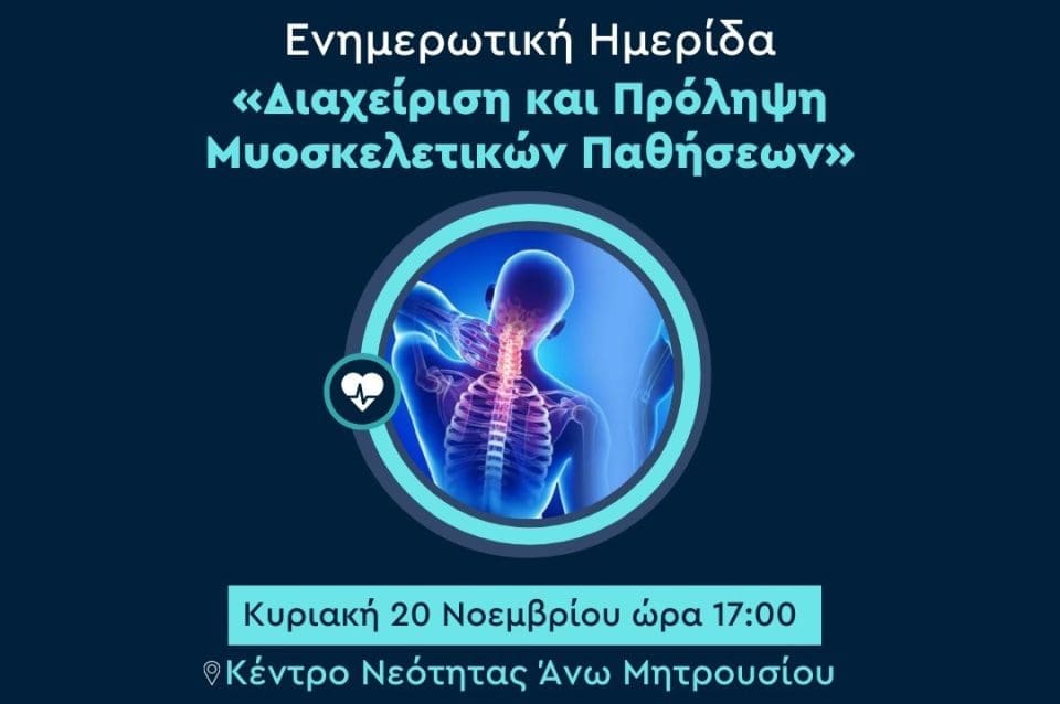 Ενημερωτική ημερίδα με θέμα «Διαχείριση και Πρόληψη Μυοσκελετικών Παθήσεων» θα πραγματοποιηθεί από τον Δήμο Σερρών και το Κέντρο Πρόληψης Νοσημάτων του Δήμου σε συνεργασία με τον Σύλλογο Γυναικών Άνω Μητρουσίου «Δήμητρα», την Κυριακή 20 Νοεμβρίου 2022 και ώρα 17:00.