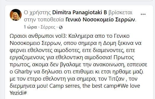 Από σήμερα Δευτέρα 16 Νοεμβρίου, η δομή των Σερρών ξεκινά να φέρνει εθελοντες αιμοδότες στο Νοσοκομείο, είτε διαμένοντες, είτε εργαζόμενους, σύμφωνα με την δημοσίευση της διοικήτριας της Δομής κας Δήμητρας Παναγιωτάκη