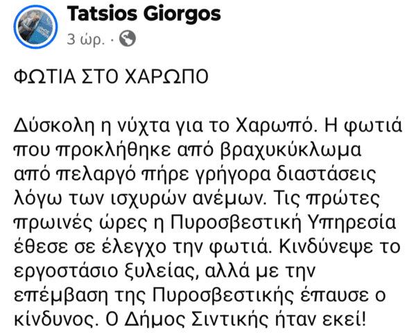 «Ο Δήμος Σιντικής ήταν εκεί! Ευχαριστούμε την Πυροσβεστική Υπηρεσία για την αποτελεσματική της παρέμβαση. Ευτυχώς αποτράπηκαν τα χειρότερα».
