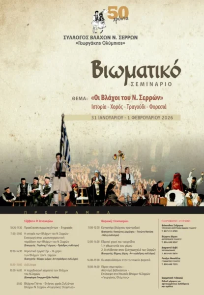Mε αφορμή τον εορτασμό 50 χρόνων λειτουργίας του Συλλόγου Βλάχων Νομού Σερρών “Γεωργάκης Ολύμπιος”, ο Σύλλογος διοργανώνει Βιωματικό Σεμινάριο το οποίο θα πραγματοποιηθεί από 31 Ιανουαρίου έως 2 Φεβρουαρίου 2026.