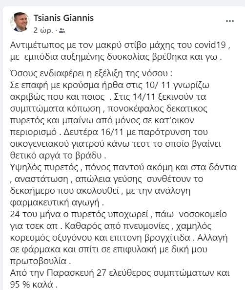 «Αντιμέτωπος με τον μακρύ στίβο μάχης του covid19 , με εμπόδια αυξημένης δυσκολίας βρέθηκα και γω .