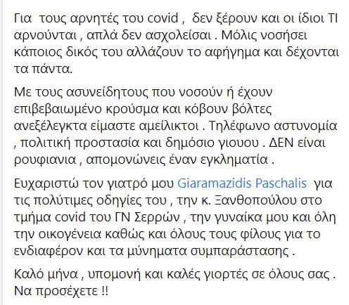 Ευχαριστώ τον γιατρό μου Giaramazidis Paschalis για τις πολύτιμες οδηγίες του , την κ. Ξανθοπούλου στο τμήμα covid του ΓΝ Σερρών , την γυναίκα μου και όλη την οικογένεια καθώς και όλους τους φίλους για το ενδιαφέρον και τα μύνηματα συμπαράστασης .