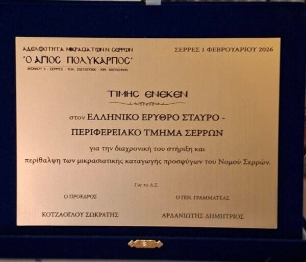 Η Αδελφότητα Μικρασιατών Ν. Σερρών «Ο Άγιος Πολύκαρπος», στα πλαίσια του ετήσιου χορού τους, απένειμε τιμητική πλακέτα στο Περιφερειακό Τμήμα Σερρών του Ελληνικού Ερυθρού Σταυρού για την προσφορά του στην τοπική κοινωνία αλλά και γενικότερα στην πολύτιμη προσφορά του Ε.Ε.Σ. στους πρόσφυγες του 1922 από την Μικρά Ασία.