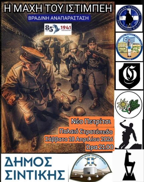 Για δεύτερη χρονιά ο Σύνδεσμος Φίλων Οχυρού Ιστίμπεη μαζί με τον Δήμο Σιντικής διοργανώνουν την ΒΡΑΔΙΝΗ αναπαράσταση της Μάχης του Ιστίμπεη στο Παλαιό Στρατόπεδο Νέου Πετριτσίου το Σάββατο 18 Απριλίου στις 21:00 μ.μ. με εντυπωσιακά εφέ ήχου και φωτισμού!