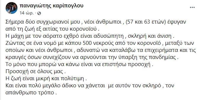 Σήμερα δύο συγχωριανοί μου , νέοι άνθρωποι , (57 και 63 ετών) έφυγαν από τη ζωή εξ αιτίας του κορονοϊού .