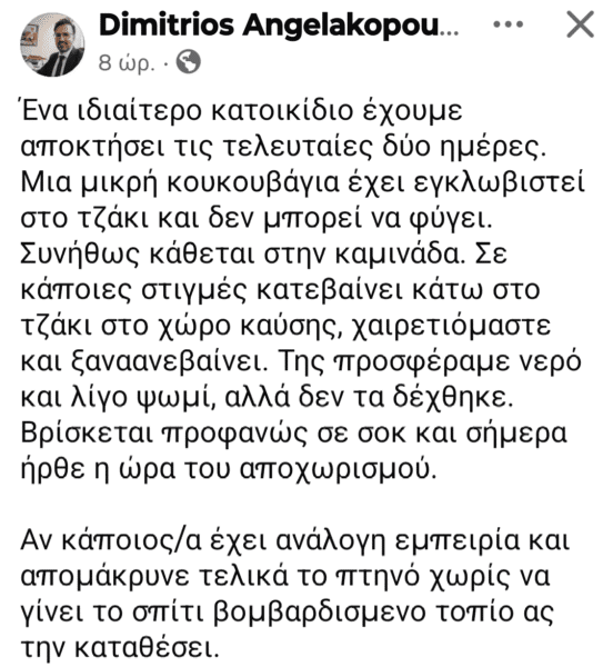 «Ένα ιδιαίτερο κατοικίδιο έχουμε αποκτήσει τις τελευταίες δύο ημέρες. Μια μικρή κουκουβάγια έχει εγκλωβιστεί στο τζάκι και δεν μπορεί να φύγει. Συνήθως κάθεται στην καμινάδα. Σε κάποιες στιγμές κατεβαίνει κάτω στο τζάκι στο χώρο καύσης, χαιρετιόμαστε και ξαναανεβαίνει. Της προσφέραμε νερό και λίγο ψωμί, αλλά δεν τα δέχθηκε. Βρίσκεται προφανώς σε σοκ και σήμερα ήρθε η ώρα του αποχωρισμού.