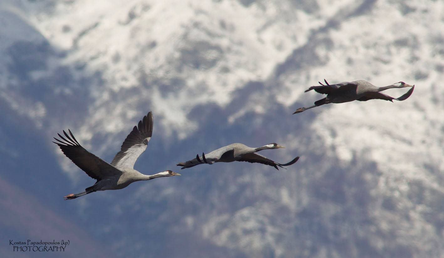 Πριν λίγες ημέρες μια μεγάλη ομάδα πουλιών στο ανατολικό τμήμα άρχισε να πετά ψηλά κάνοντας κύκλους, όπως οι πελεκάνοι που αναζητούν θερμικά ανοδικά ρεύματα όταν θέλουν να μετακινηθούν σε άλλες περιοχές. Λίγοι γερανοί πλέον έχουν παραμείνει στην περιοχή και τους εντοπίσαμε σε πτήση κοντά στη λίμνη με φόντο το όρος Κερκίνη και τα τελευταία χιόνια του!