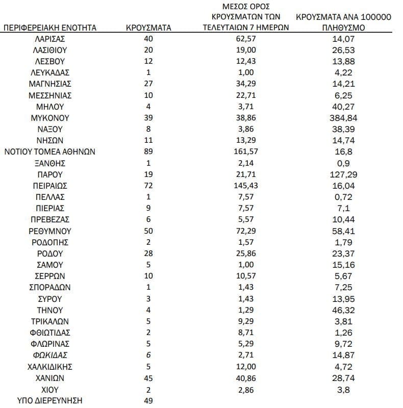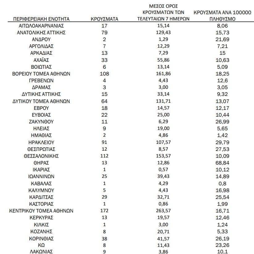 Σημ.: αναγράφονται μόνο οι ΠΕ στις οποίες έχουν καταγραφεί κρούσματα κατά τη σημερινή αναφορά.