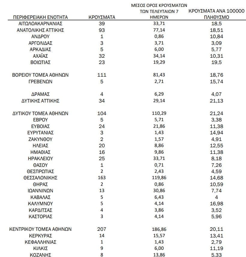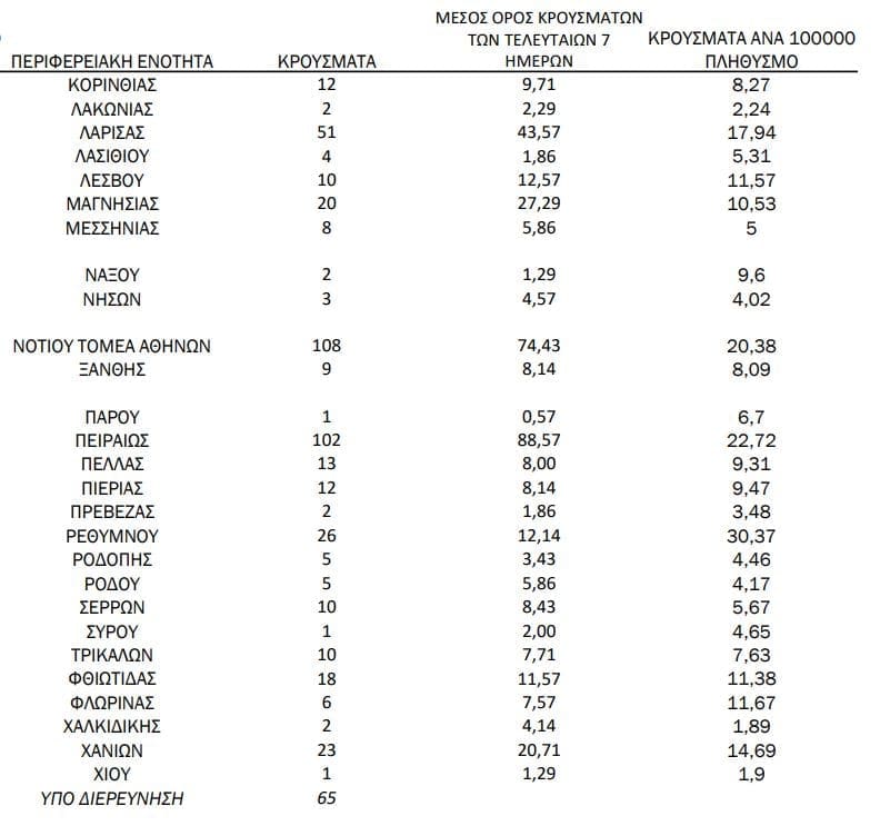 Σημ.: αναγράφονται μόνο οι ΠΕ στις οποίες έχουν καταγραφεί κρούσματα κατά τη σημερινή αναφορά.