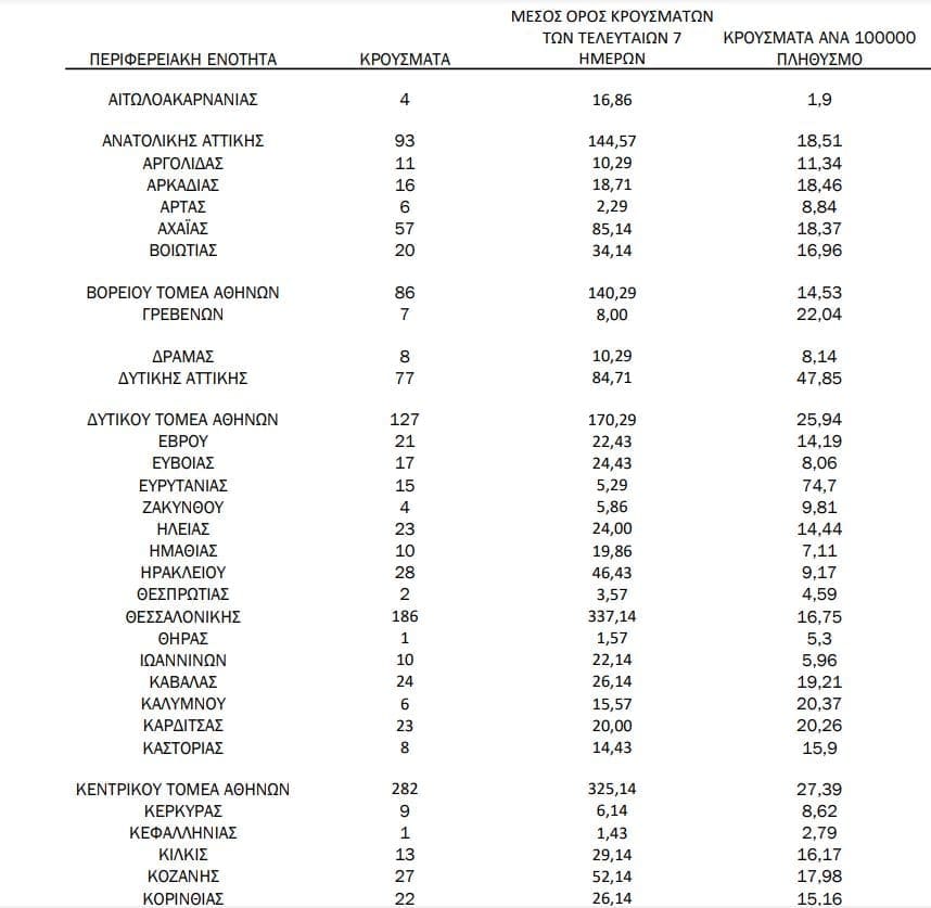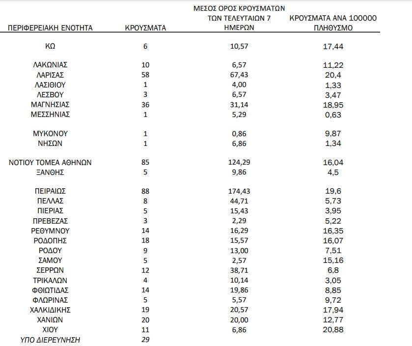 Σημ.: αναγράφονται μόνο οι ΠΕ στις οποίες έχουν καταγραφεί κρούσματα κατά τη σημερινή αναφορά.