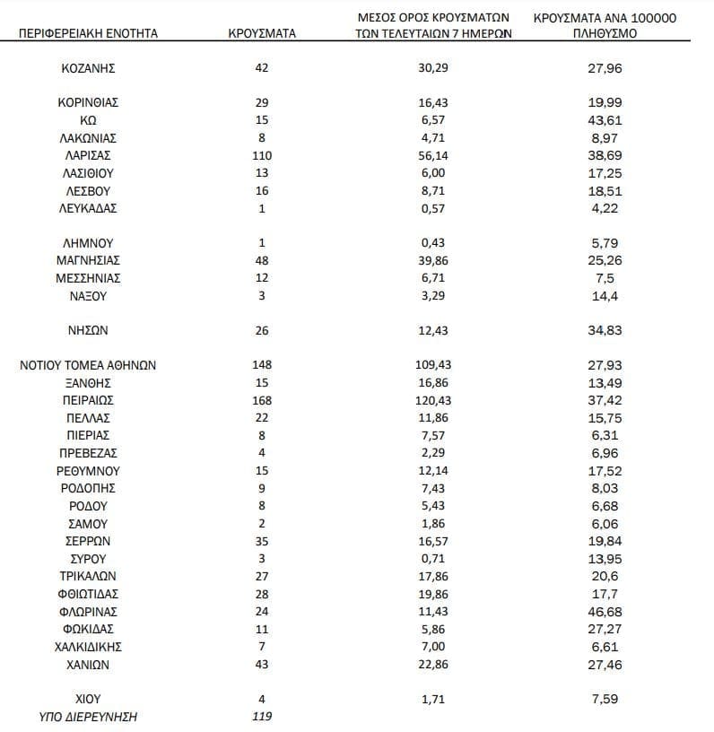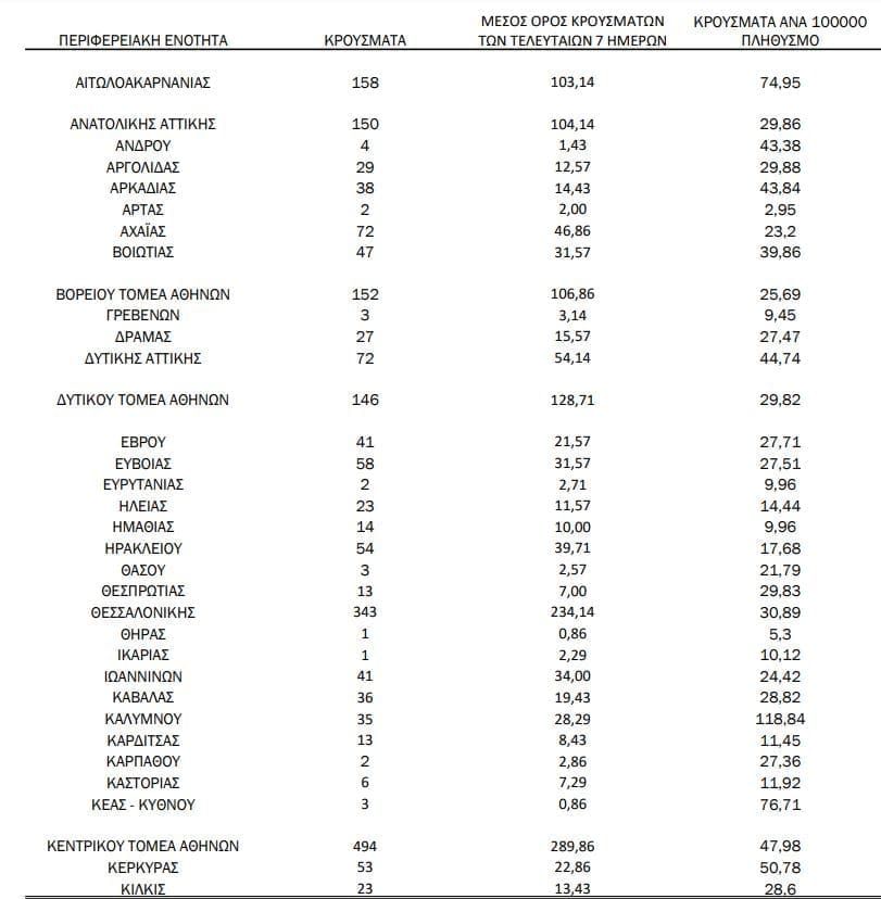 Σημ.: αναγράφονται μόνο οι ΠΕ στις οποίες έχουν καταγραφεί κρούσματα κατά τη σημερινή αναφορά.