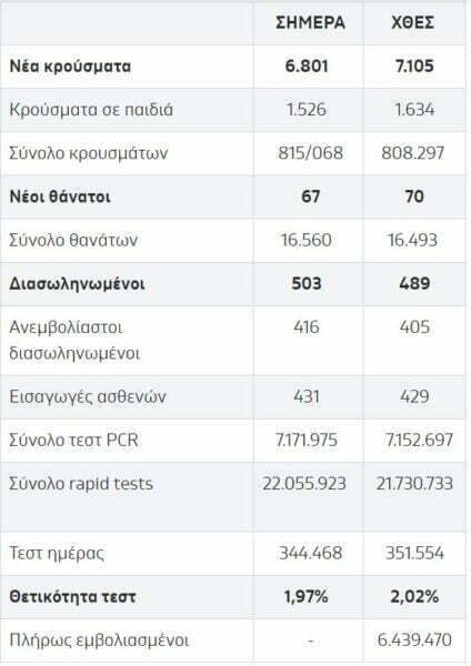 Σήμερα 11 Νοεμβρίου 2021, από τον ΕΟΔΥ ανακοινώθηκαν συνολικά 6.801 νέα κρούσματα κορωνοϊού.