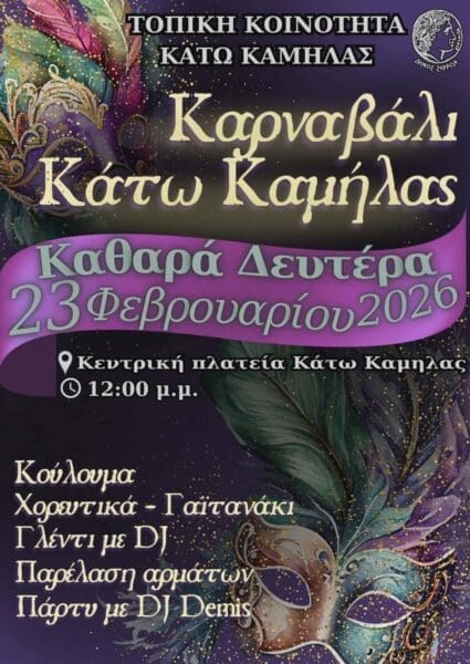 Η Τοπική Κοινότητα Κάτω Καμήλας του Δήμου Σερρών διοργανώνει το καθιερωμένο Καρναβάλι την Καθαρά Δευτέρα 23 Φεβρουαρίου 2026, στις 12.00 μ.μ. στην κεντρική πλατεία του χωριού.