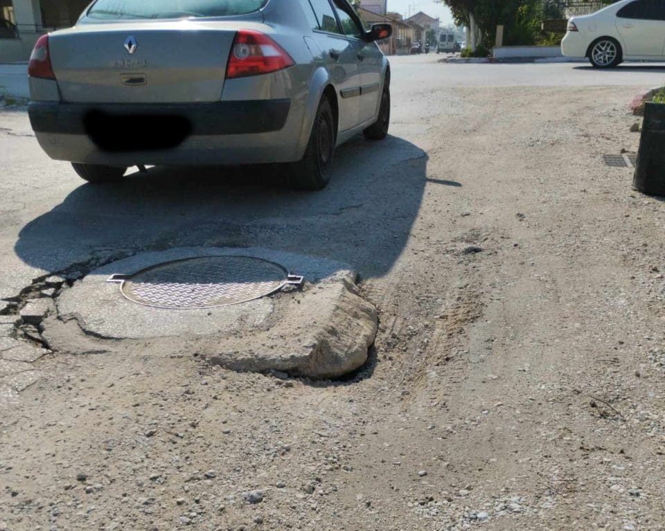 Όπως φαίνεται και στην φωτογραφία που δημοσιεύει η Μαρία Καραμάνου στα social media, η λακκούβα γύρω από το φρεάτιο σε κάποια σημεία ξεπερνά τους 30 πόντους με αποτέλεσμα να κινδυνεύουν τα αυτοκίνητα με σοβαρή βλάβη αν πέσουν μέσα.