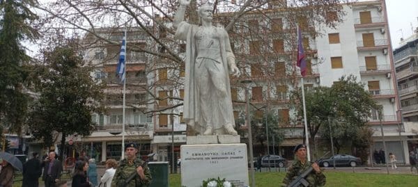 Ακολούθησε μετάβαση στον Ανδριάντα του Εμμανουήλ Παπά στην πλατεία Ελευθερίας, όπου τελέστηκε επιμνημόσυνη δέηση ενώ στη συνέχεια πραγματοποιήθηκε κατάθεση στεφάνων από τους εκπροσώπους της πολιτικής, πολιτειακής ηγεσίας και των σωμάτων ασφαλείας.