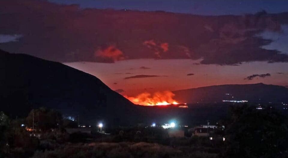 Η φωτιά καίει χαμηλή βλάστηση, ενώ στο σημείο επιχειρούν 45 πυροσβέστες με 12 οχήματα και 3 ομάδες πεζοπόρων τμημάτων.