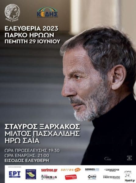 Ο Πρόεδρος της Κοινωφελούς Επιχείρησης του Δήμου Σερρών (Κ.Ε.ΔΗ.Σ.) κ.Γεώργιος Ταϊρης αναφέρθηκε στη μεγάλη συναυλία της Πέμπτης, όπου η είσοδος για το κοινό θα είναι ελεύθερη, επισημαίνοντας χαρακτηριστικά: «Όσοι Σερραίοι επιθυμούν μπορούν να έρθουν στο Πάρκο Ηρώων και να απολαύσουν τον μεγάλο μουσικοσυνθέτη κ.Σταύρο Ξαρχάκο, ο οποίος θα παρουσιάσει ένα πρόγραμμα με τα ωραιότερα τραγούδια του, χρωματισμένα με την ακριβή ερμηνεία των τραγουδιστών Μίλτου Πασχαλίδη και Ηρώς Σαΐα. Ο Σταύρος Ξαρχάκος, έχοντας στο πλευρό του αυτούς τους δύο σπουδαίους τραγουδιστές και διευθύνοντας ο ίδιος επί σκηνής πολυμελή ορχήστρα κορυφαίων σολίστ, θα μας χαρίσει ένα σπάνιο ταξίδι ήχων και συναισθημάτων στα μουσικά του έργα.»