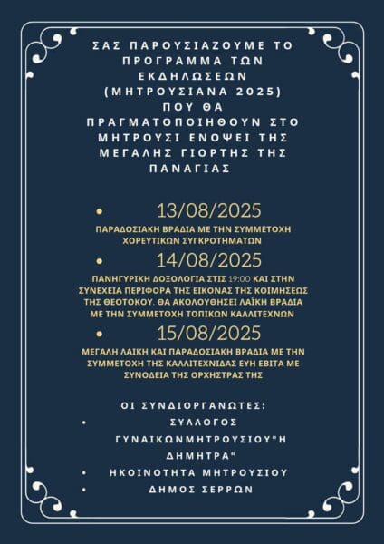 Τριήμερο πολιτιστικών εκδηλώσεων με την επωνυμία «Μητρουσιανά 2025» διοργανώνει, από τις 13 ως τις 15 Αυγούστου στην κεντρική πλατεία Μητρουσίου, ο Σύλλογος Γυναικών Άνω Μητρουσίου «Η Δήμητρα» με την στήριξη της τοπικής κοινότητας και του Δήμου Σερρών.