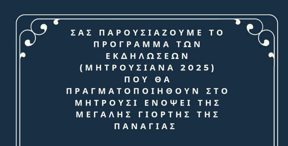 Τριήμερο πολιτιστικών εκδηλώσεων με την επωνυμία «Μητρουσιανά 2025» διοργανώνει, από τις 13 ως τις 15 Αυγούστου στην κεντρική πλατεία Μητρουσίου, ο Σύλλογος Γυναικών Άνω Μητρουσίου «Η Δήμητρα» με την στήριξη της τοπικής κοινότητας και του Δήμου Σερρών.