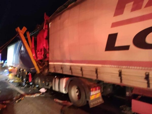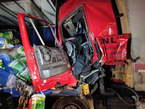 Σύμφωνα με πληροφορίες της ΕΡΤ Σερρών, μετά από μια δύσκολη επιχείρηση, απεγκλωβίστηκε ο οδηγός της νταλίκας, που -όπως φαίνεται στις εικόνες- το παρμπρίζ της μετατράπηκε σε άμορφη μάζα.
