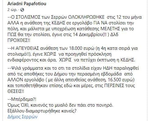 Δείτε πως σχολιάζει η επικεφαλής της παράταξης “Δύναμη Σερραίων”, Αριάδνη Παπαφωτίου, τον στολισμό της πόλης, με απευθείας ανάθεση και αφού ο στολισμός είχε…ολοκληρωθεί!