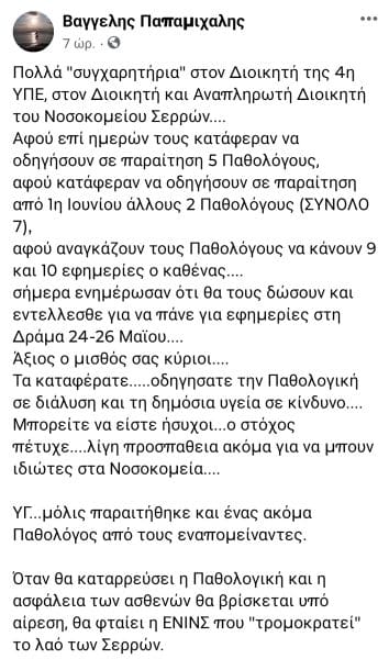 Όταν θα καταρρεύσει η Παθολογική και η ασφάλεια των ασθενών θα βρίσκεται υπό αίρεση, θα φταίει η ΕΝΙΝΣ που “τρομοκρατεί” το λαό των Σερρών.”