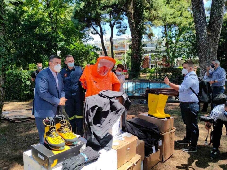 Εξοπλισμό και μέσα ατομικής προστασίας παρέδωσε χθες, Τρίτη 15 Ιουνίου 2021, ο Περιφερειάρχης Κεντρικής Μακεδονίας Απόστολος Τζιτζικώστας, στα στελέχη της ΕΜΑΚ, των δομών Πολιτικής Προστασίας και των εθελοντικών ομάδων της Μητροπολιτικής Ενότητας Θεσσαλονίκης, παρουσία του Αντιπεριφερειάρχη Σερρών Παναγιώτη Σπυρόπουλου και των λοιπών Αντιπεριφερειαρχών της ΠΚΜ.