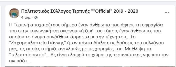 Η Τερπνή αποχαιρέτησε σήμερα έναν άνθρωπο που άφησε τη σφραγίδα του στην κοινωνική και οικονομική ζωή του τόπου, έναν άνθρωπο, του οποίου το όνομα συνδέθηκε άρρηκτα με την τέχνη του… Το “Ζαχαροπλαστείο Γιάννης” ήταν πάντα δίπλα στις δράσεις του συλλόγου μας, τις οποίες στήριζε ανελλιπώς με τις χορηγίες του. Με θλίψη το “τελευταίο αντίο”… Ας είναι ελαφρύ το χώμα της τερπνιώτικης γης που τον σκεπάζει…