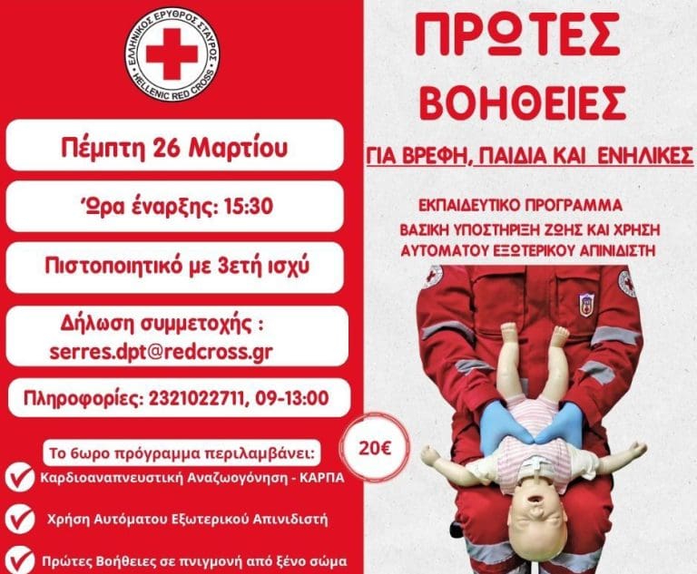 Ελληνικός Ερυθρός Σταυρός (Σερρών) – Σεμινάριο Πρώτων Βοηθειών, για βρέφη, παιδιά και ενήλικες.