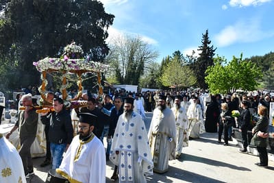 Εν συνεχεία, το αποκαθηλωθέν «Σώμα» του Κυρίου μας οδηγήθηκε λιτανευτικώς στο πλησίον του υπερώου λελατομημένο εκ πέτρας κενοτάφιο. Προ της απολύσεως, ο Σεβασμιώτατος ευχήθηκε υπέρ μακαρίας και αιωνίου αναπαύσεως των ψυχών όλων των κεκοιμημένων αδελφών μας, οι οποίοι, όπως χαρακτηριστικώς ετόνισε, αναμένουν την κοινή Ανάσταση λουσμένοι στο ανέσπερο Φως της αιωνιότητος, που μόνον ο Χριστός, η Ανάσταση και η Ζωή μας χαρίζει.