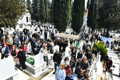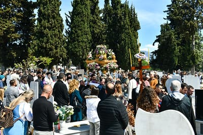 Ακολούθως, στις 12:30 μ.μ., στον χώρο έμπροσθεν του ιερού Ναού Ζωοδόχου Πηγής του Β’ Κοιμητηρίου Σερρών τελέσθηκε η ιερά ακολουθία του Επιταφίου θρήνου κατά την διάρκεια της οποίας ο χοροστατών Σεβ. κ. Θεολόγος ανέπεμψε ειδική δέηση υπέρ αναπαύσεως των ψυχών και των εκ της νόσου Covid-19 κεκοιμημένων αδελφών μας, οι οποίοι αναπαύονται στο ως είρηται Κοιμητήριο και ακολούθως πραγματοποιήθηκε η εντός του Κοιμητηρίου λιτάνευση του Επιταφίου.