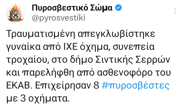 Άμεσα στο σημείο έσπευσαν οκτώ πυροσβέστες με τρία οχήματα, οι οποίοι προχώρησαν στον απεγκλωβισμό της συνοδηγού του βαν, σερβικής καταγωγής. Η τραυματίας μεταφέρθηκε με ασθενοφόρο του ΕΚΑΒ στο νοσοκομείο για περαιτέρω περίθαλψη.