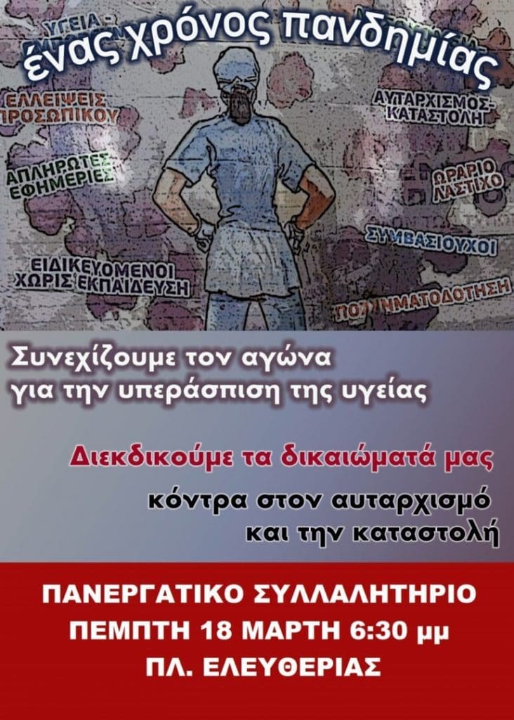 Ένας Χρόνος Πανδημίας. Συνεχίζουμε τον αγώνα για την υπεράσπιση της υγείας και διεκδικούμε τα δικαιώματα μας, κόντρα στον αυταρχισμό και την καταστολή.