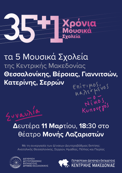 Το Μουσικό Σχολείο Σερρών συμμετέχει σε εκδήλωση που διοργανώνει η Διεύθυνση Δευτεροβάθμιας Εκπαίδευσης Δυτικής Θεσσαλονίκης τιμώντας τα 35+1 χρόνια από την ίδρυση και λειτουργία του πρώτου Μουσικού Σχολείου και την ειδικότερη προσφορά του θεσμού στην υπηρεσία της μουσικής τέχνης, της παιδείας και του πολιτισμού, προβάλλοντας ταυτόχρονα και την ανάγκη ίδρυσης του Μουσικού Σχολείου Δυτικής Θεσσαλονίκης. Η εκδήλωση θα πραγματοποιηθεί με την σύμπραξη μαθητών/τριών από τα μουσικά σύνολα των πέντε (5) Μουσικών Σχολείων της Περιφέρειας Κεντρικής Μακεδονίας (Θεσσαλονίκης, Σερρών, Κατερίνης, Βέροιας και Γιαννιτσών) την Δευτέρα 11 Μαρτίου 2024 στις 18.30 στο θέατρο της Μονής Λαζαριστών Θεσσαλονίκης.